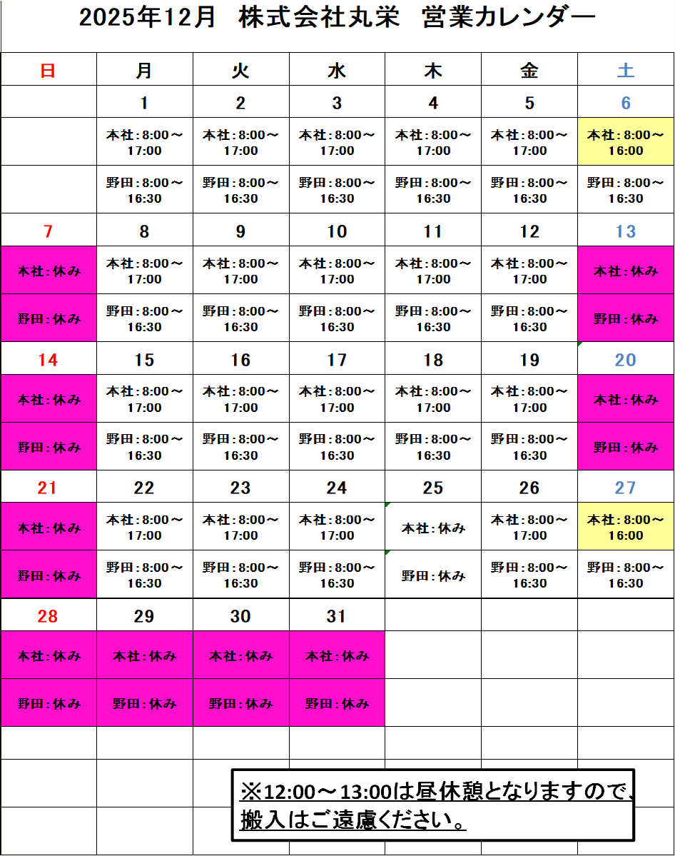 - 本社工場: 12月の第2・第3土曜日は休業いたします。