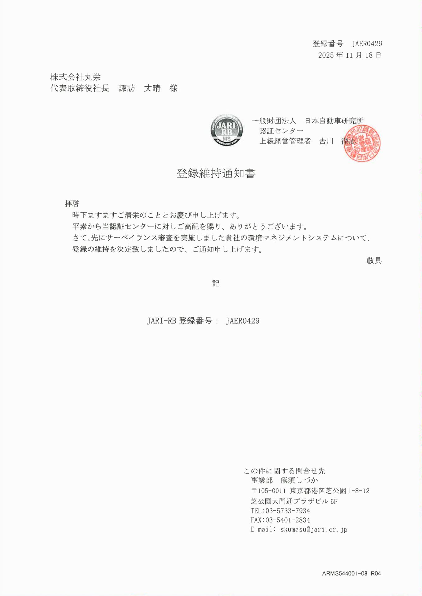 今年も環境ISOの登録を維持しました。初めての登録は2002年12月でしたが、それ以来ずっと23年間登録の維持を続けています。