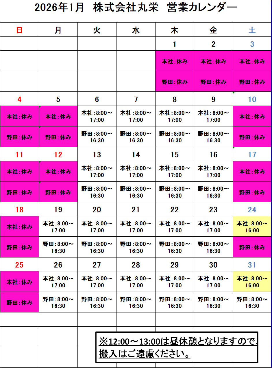 - 野田工場: 1月の第1・第2・第3・第4土曜日は休業いたします。