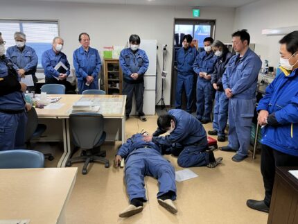 丸栄従業員は救命講習会に出席して、基本的心肺蘇生法やAED使用法など実技を中心に学んでいます。